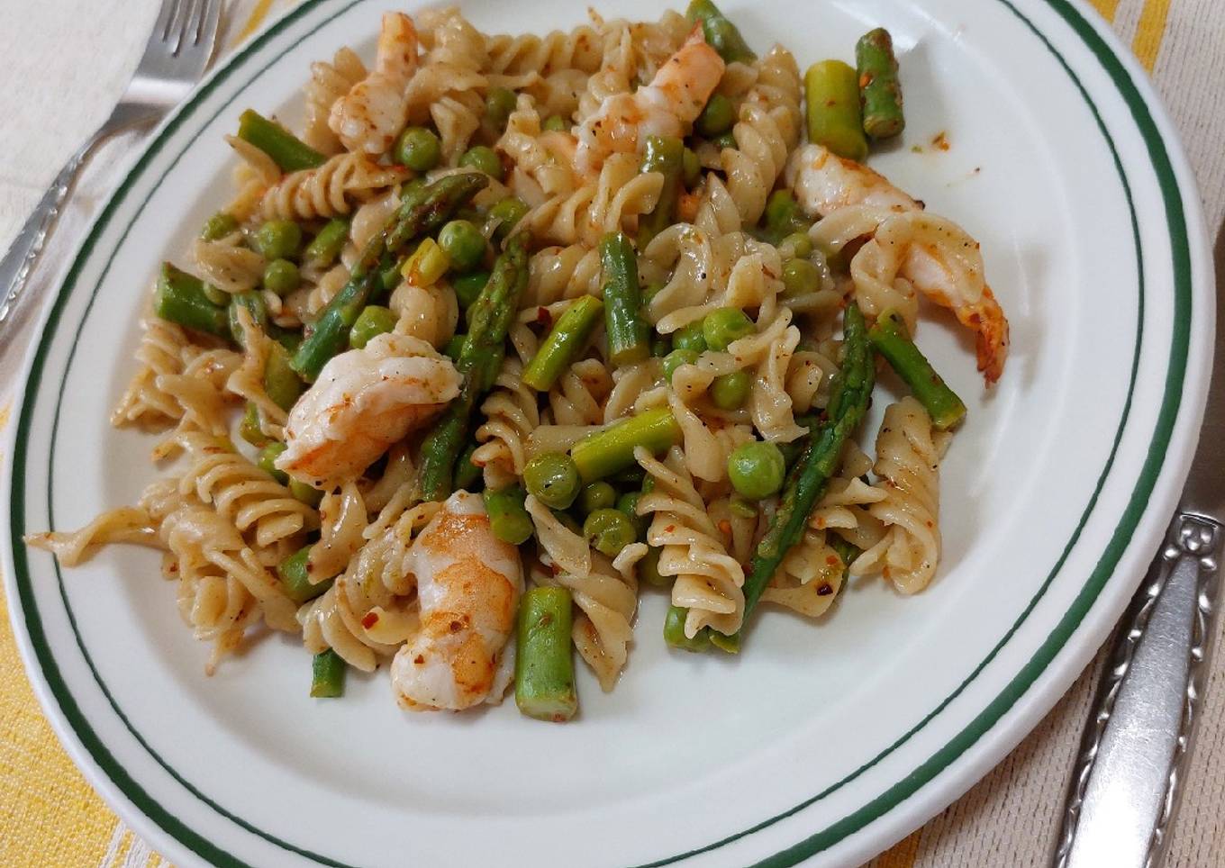 Pasta con espárragos, camarones y chícharos en una sola olla