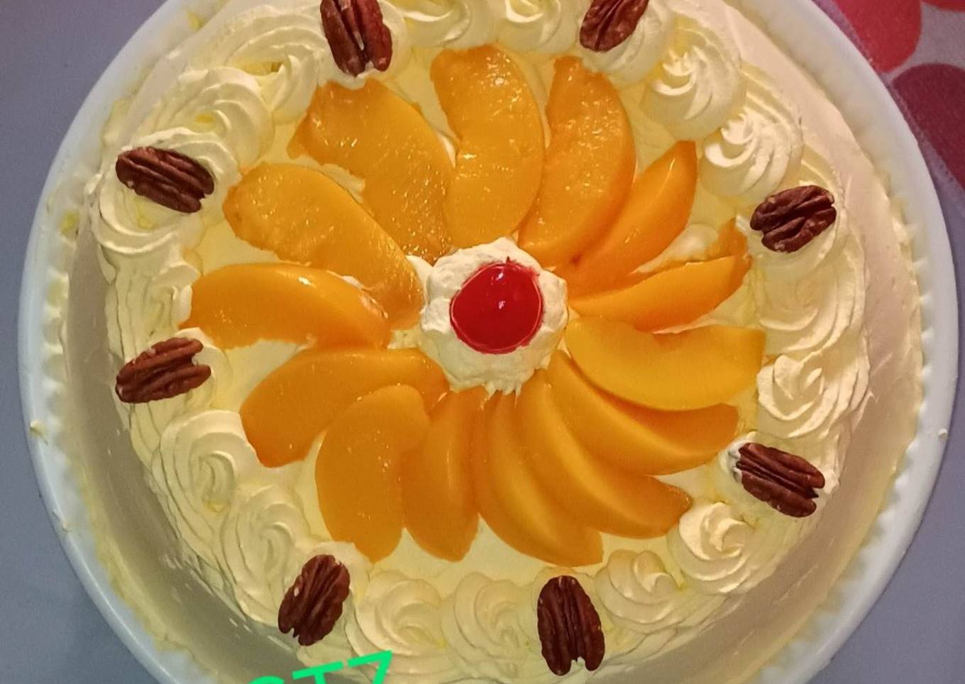 - Colocas la otra parte del pan encima le pones otro poco de las tres leches luego la crema para batir y le moldeas a que quede liso con alguna espátula, luego decora a tu gusto con los duraznos, la nuez a la mitad y la cereza.