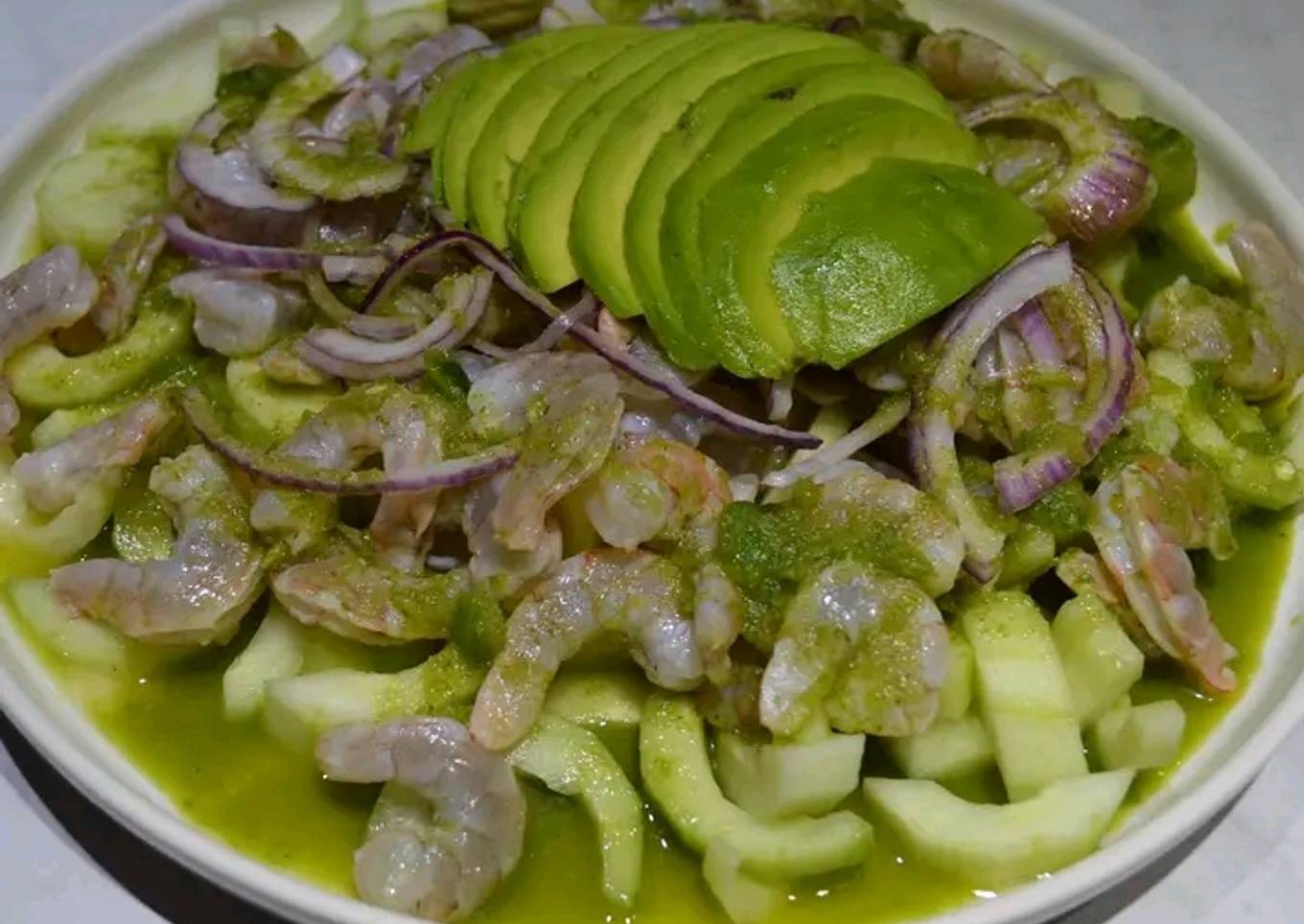 - Pela, corta y lava los camarones, cuece con el zumo de 7 limones. Por otro lado, cortar en medialunas los pepinos y las cebollas moradas.