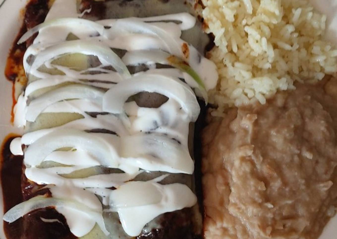 - Una vez que el mole está listo, colocas en un plato tres taquitos, los bañas con el mole, les agregas queso, crema y cebolla en rodajas para adornar. Se pueden acompañar con arroz y frijoles.
