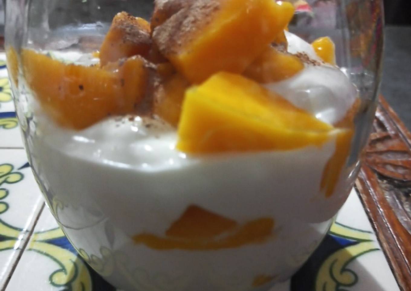 - En un frasco o recipiente coloca 1 cucharada grande de mezcla de yogurth, luego cubos de mango, continua hasta terminar. Espolvorea canela. Congela.por 30 min.