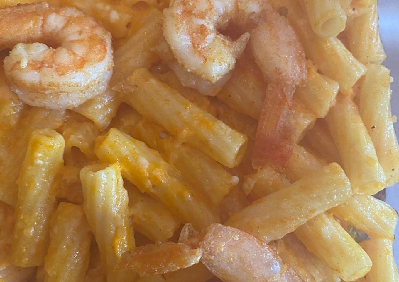 Nuestros camarones congelados los ponemos a remojar en agua fría con sal y una vez descongelados ponemos en una ollita un diente de ajo grande picado, aceite de oliva, nuestros camarones (12 para esa cantidad de pasta), les ponemos sal, pimentón dulce y ajo en polvo, los salteamos, los repartimos sobre la pasta, le ponemos queso parmesano, cubrimos con papel aluminio y metemos al horno.