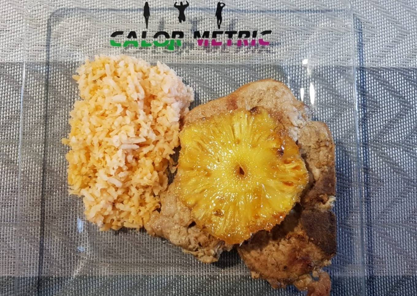 - Una vez estén doradita la chuleta de puerco servirla con la rebanada de piña para cada chuleta y servir con 1/2 taza de arroz