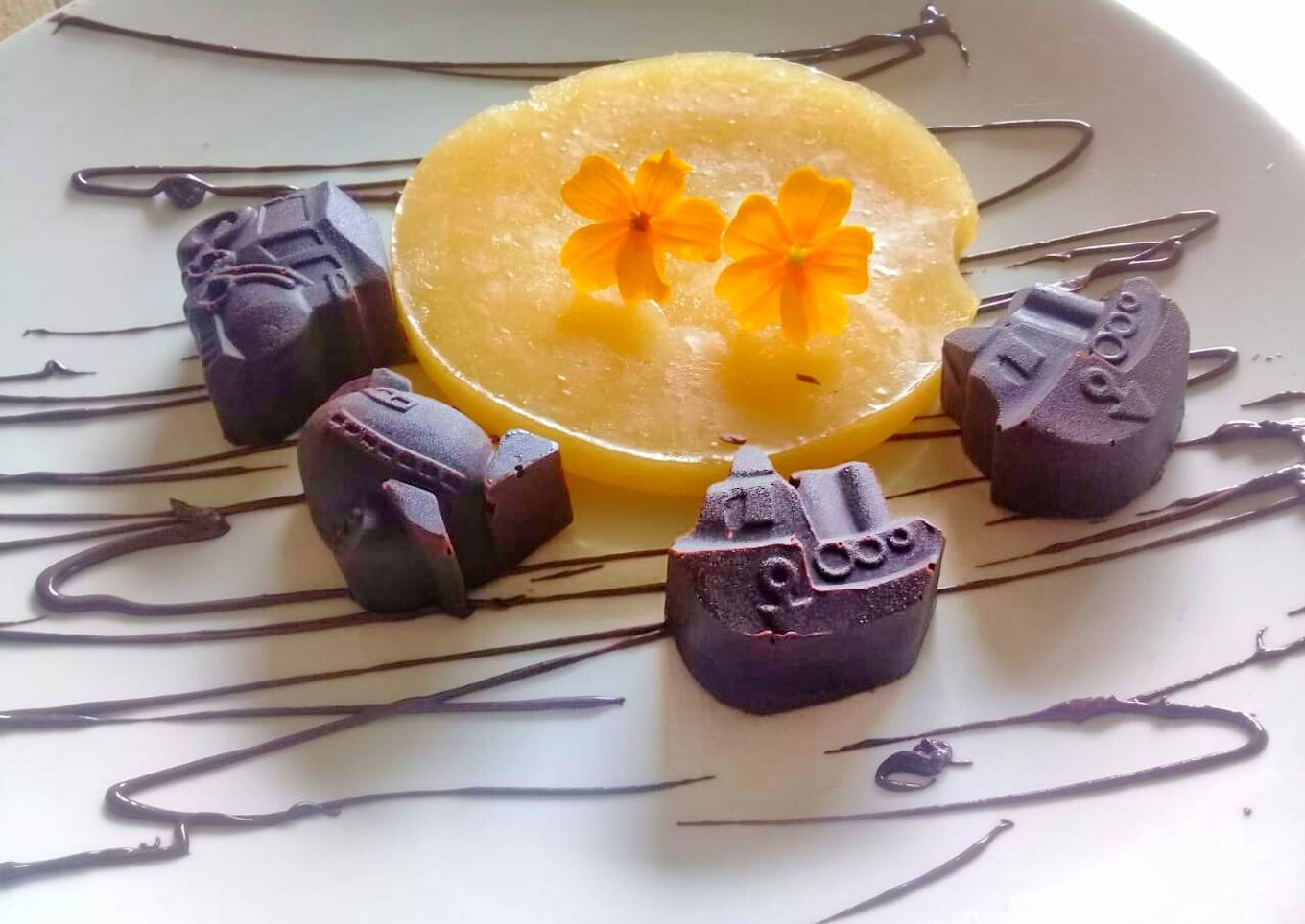 - Lo sacamos del refrigerador y ponemos el relleno de gelatina dejando 1 o 2 milímetros de espacio para poner una capa de chocolate y cerrar el bombón