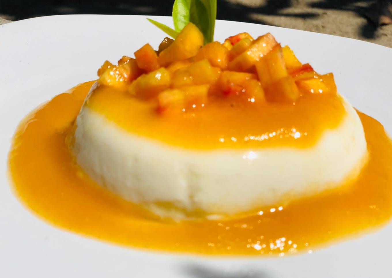 - Para él coulis de durazno, picamos en cubos la cuarta párate la otra la licuamos junto con azúcar y un poco de jugo de limón