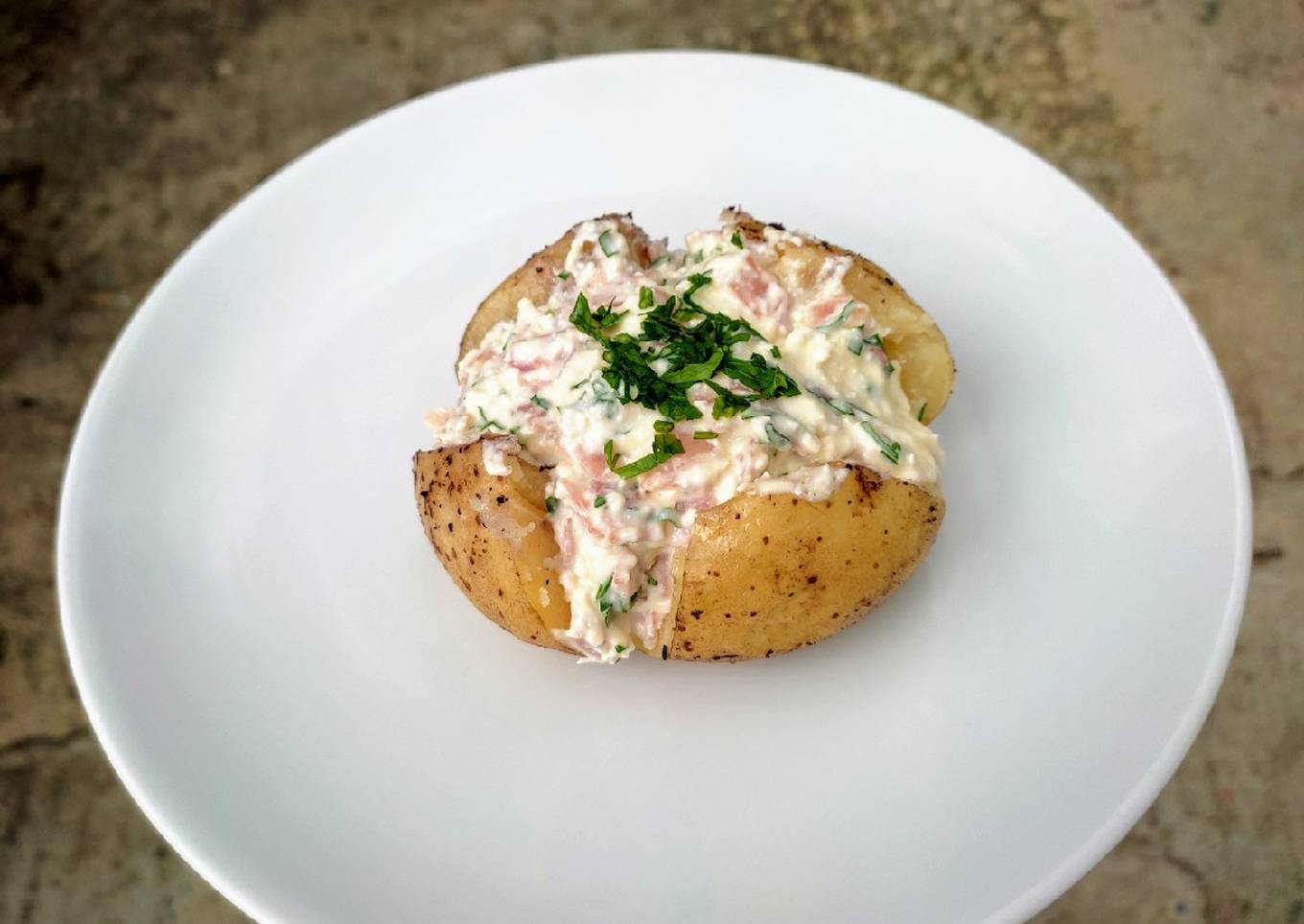 - Mezclar la crema, jamón, perejil, y servir encima de la papa.